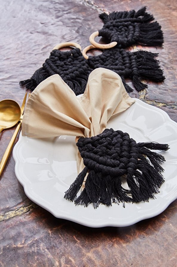4lü Siyah El İşlemesi Makromeli Peçete Halkası